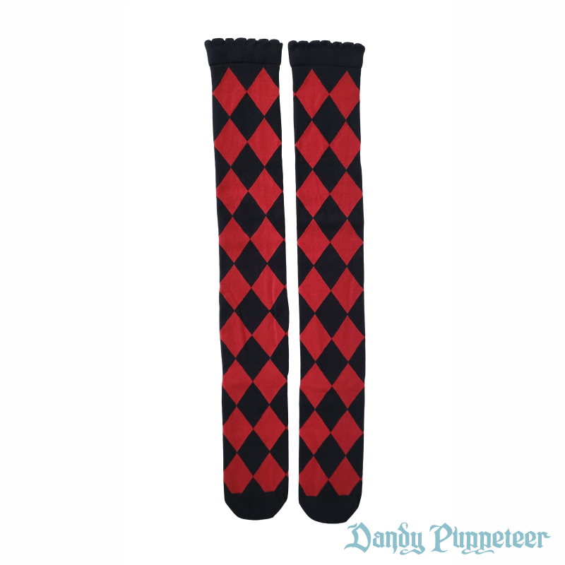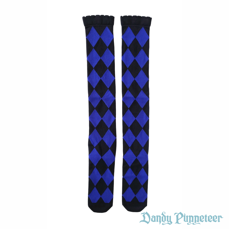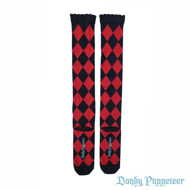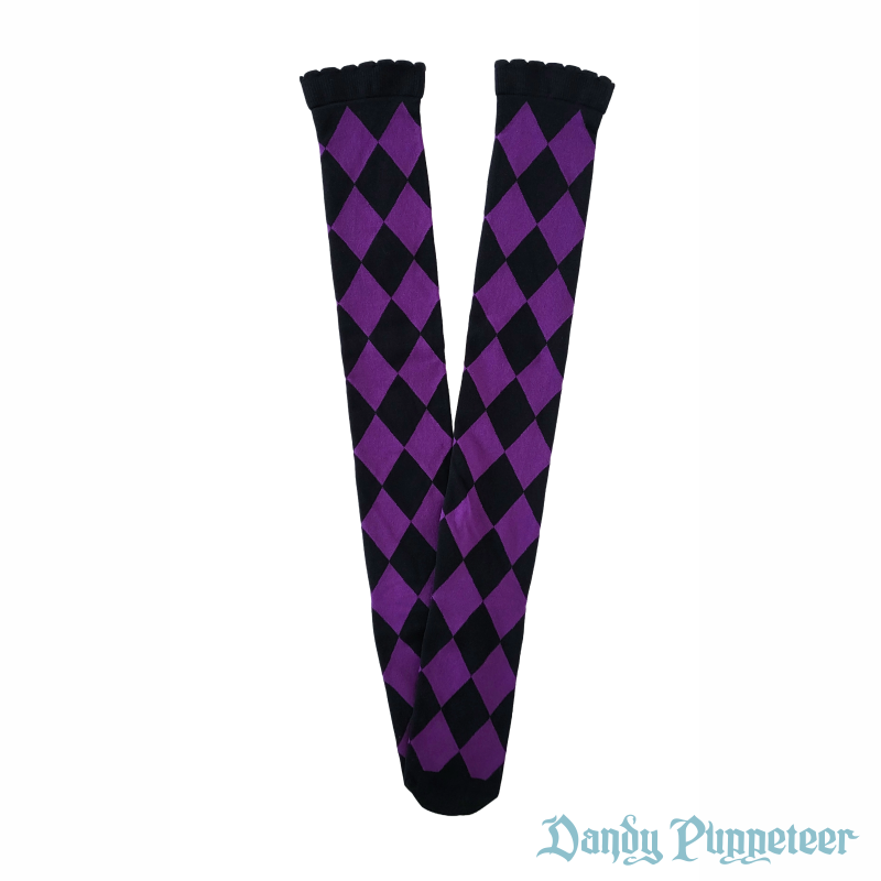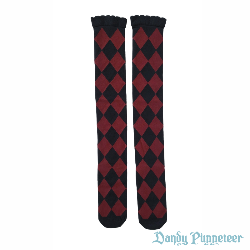 The Harlequin Diamond Over Knee Socks feature a repeating diamond pattern and ruffled cuffs.