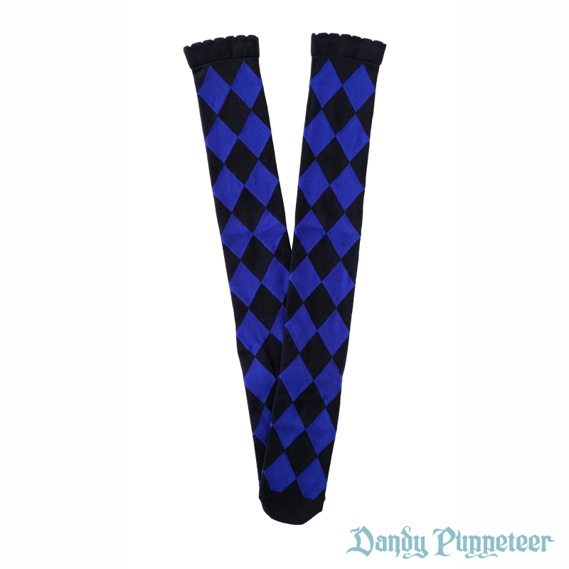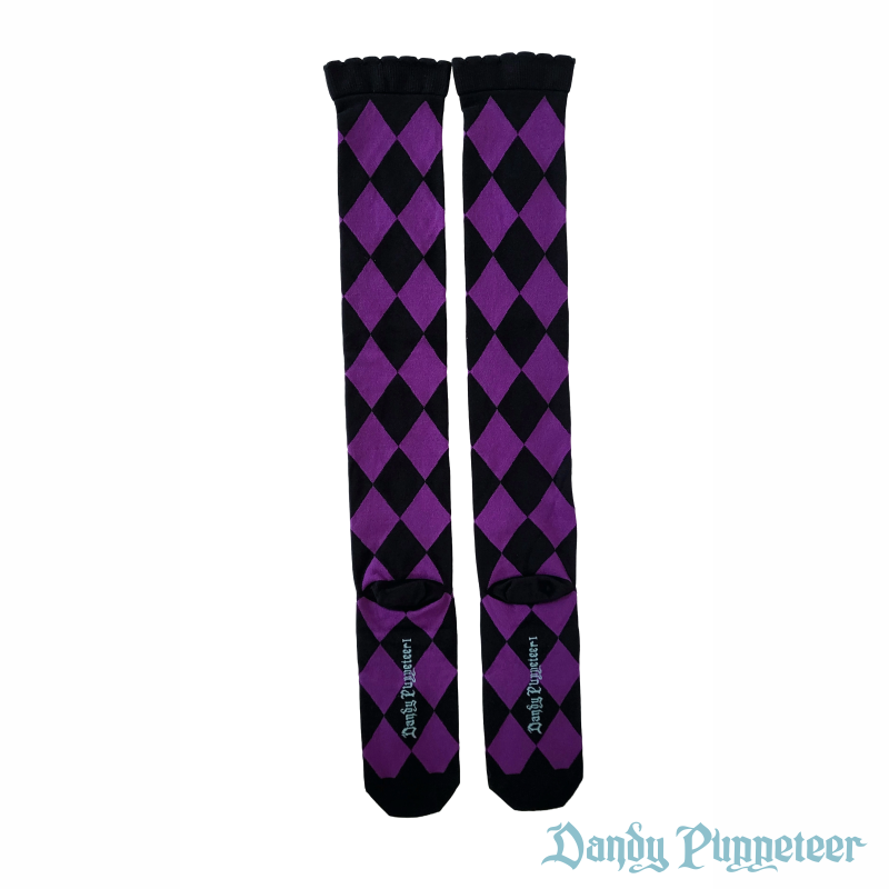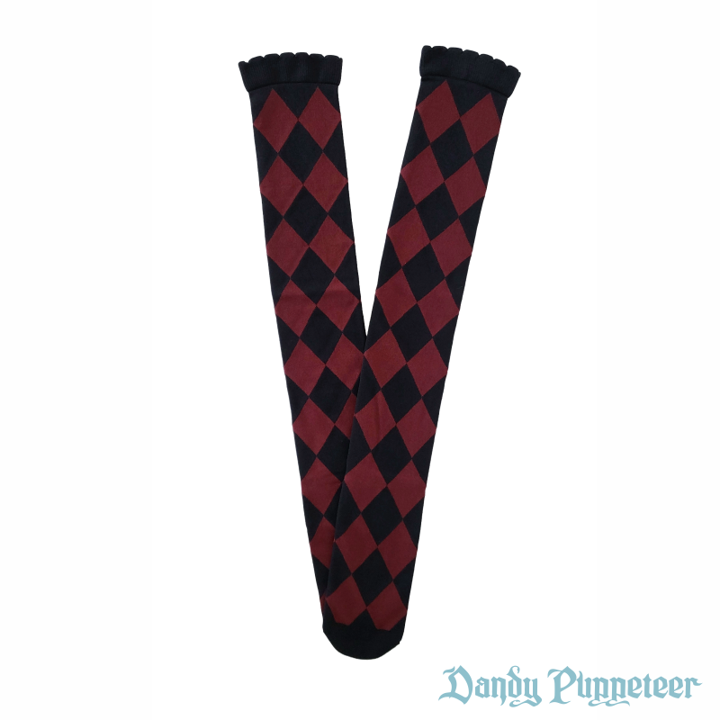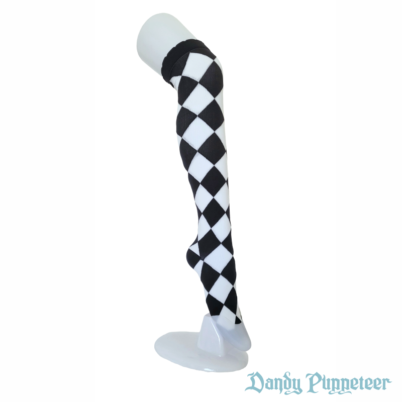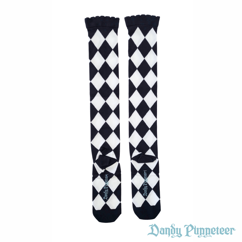 The Harlequin Diamond Over Knee Socks feature a repeating diamond pattern and ruffled cuffs.