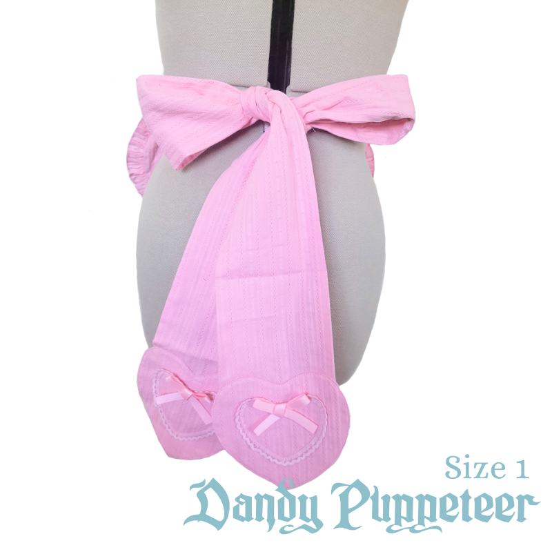 For Size 1, the apron has a 9.5in x 8in heart window and measures a 100 inch total length. Best recommended for waists under 40 inches. Mannequin model is set at 32 inch waist.