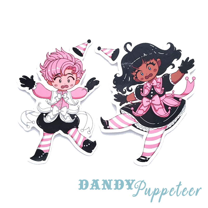 A set of 2 stickers featuring art reflective of the Jester Apron & Jester Collar set.