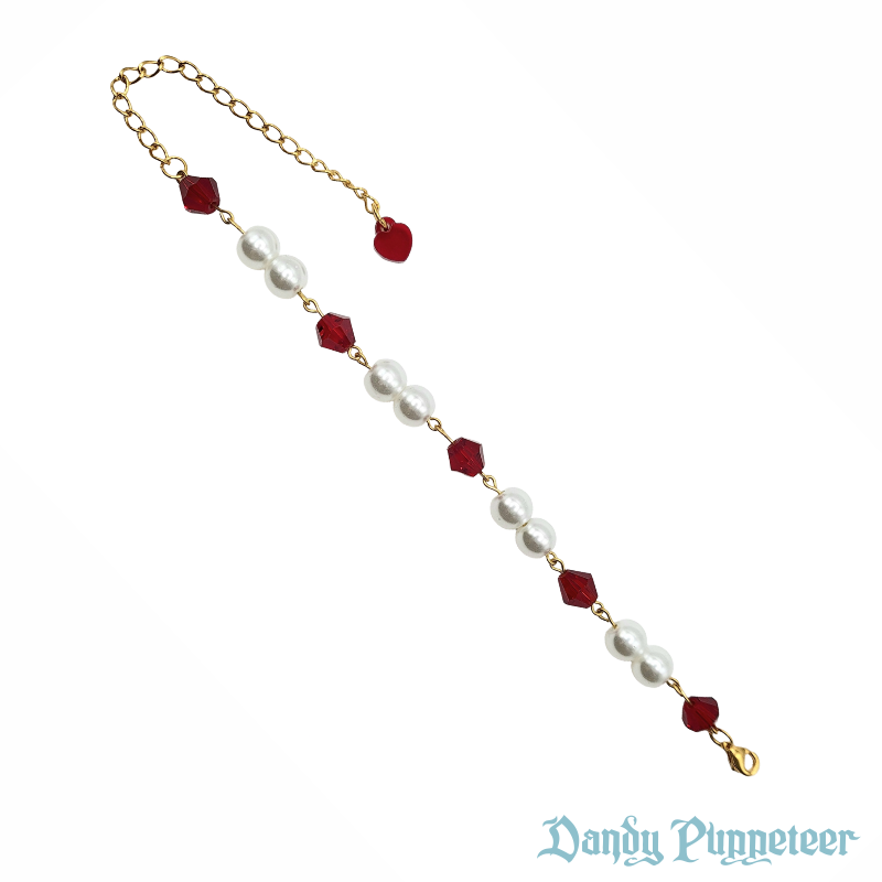 Made of white plastic pearl beads and red glass bicone beads.