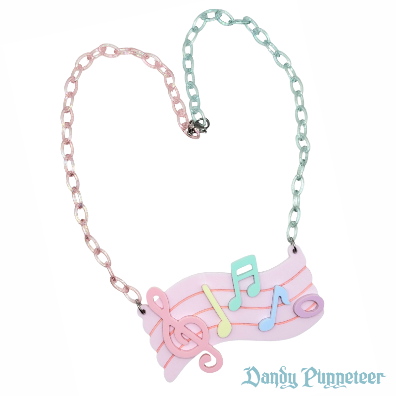 Made of glossy layered acrylic and painted engraved details in the shape of sheet music with notes.